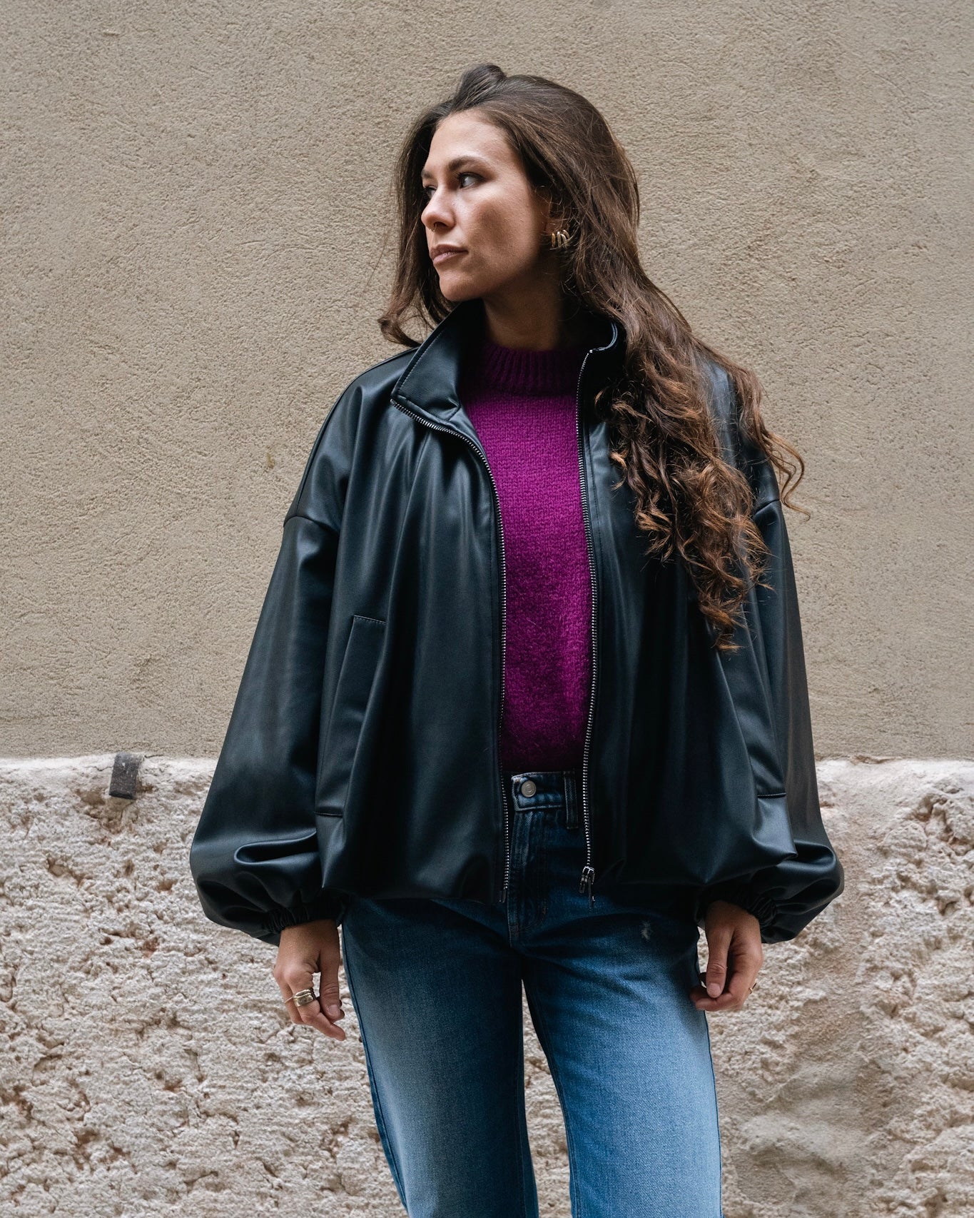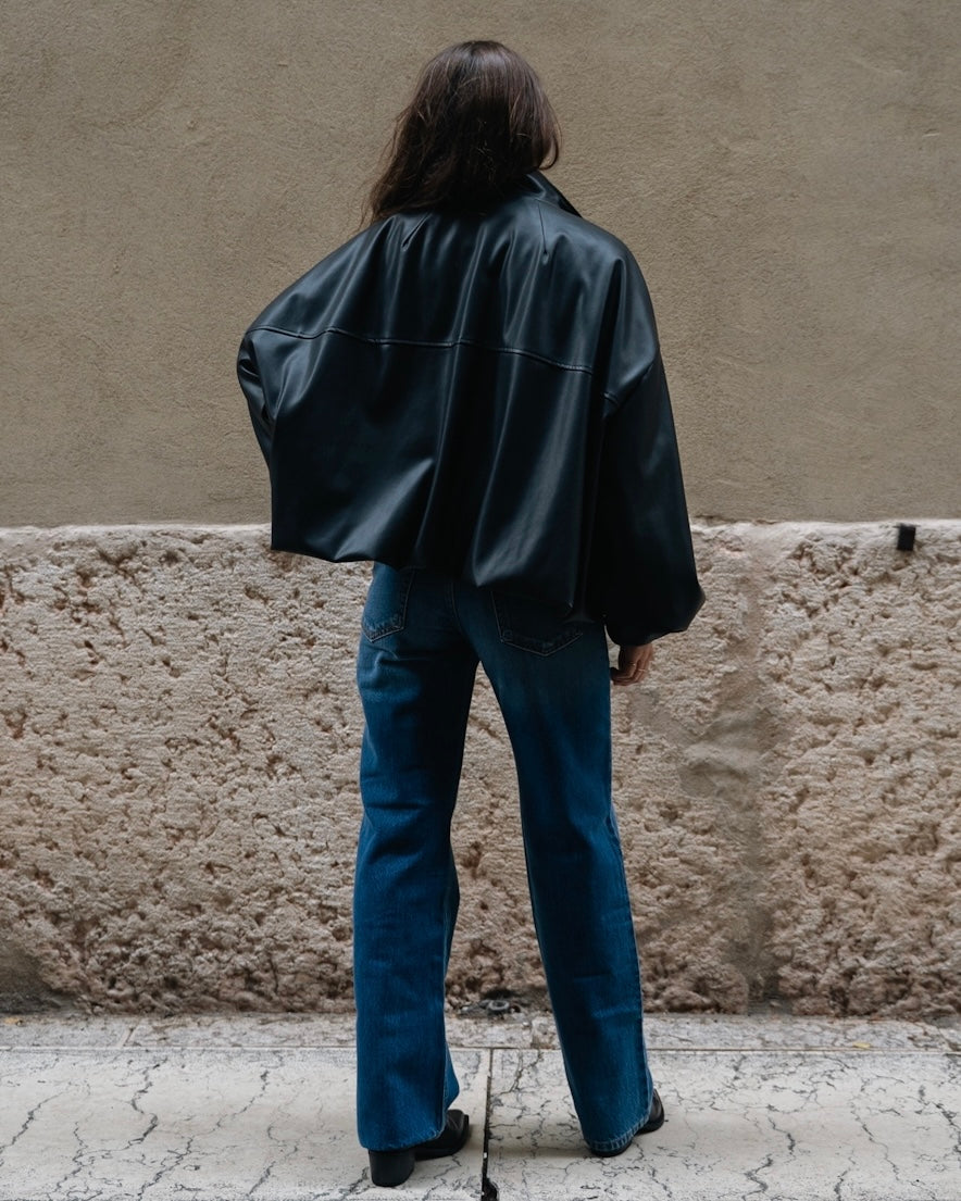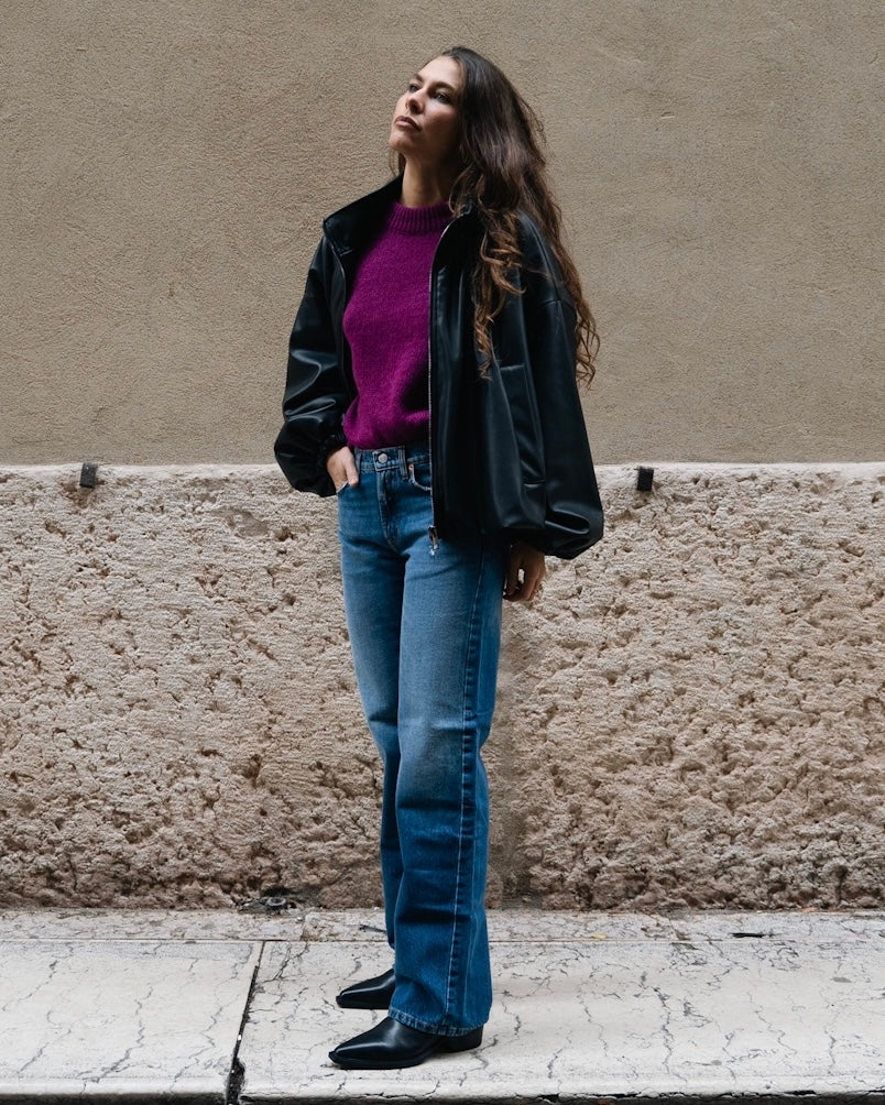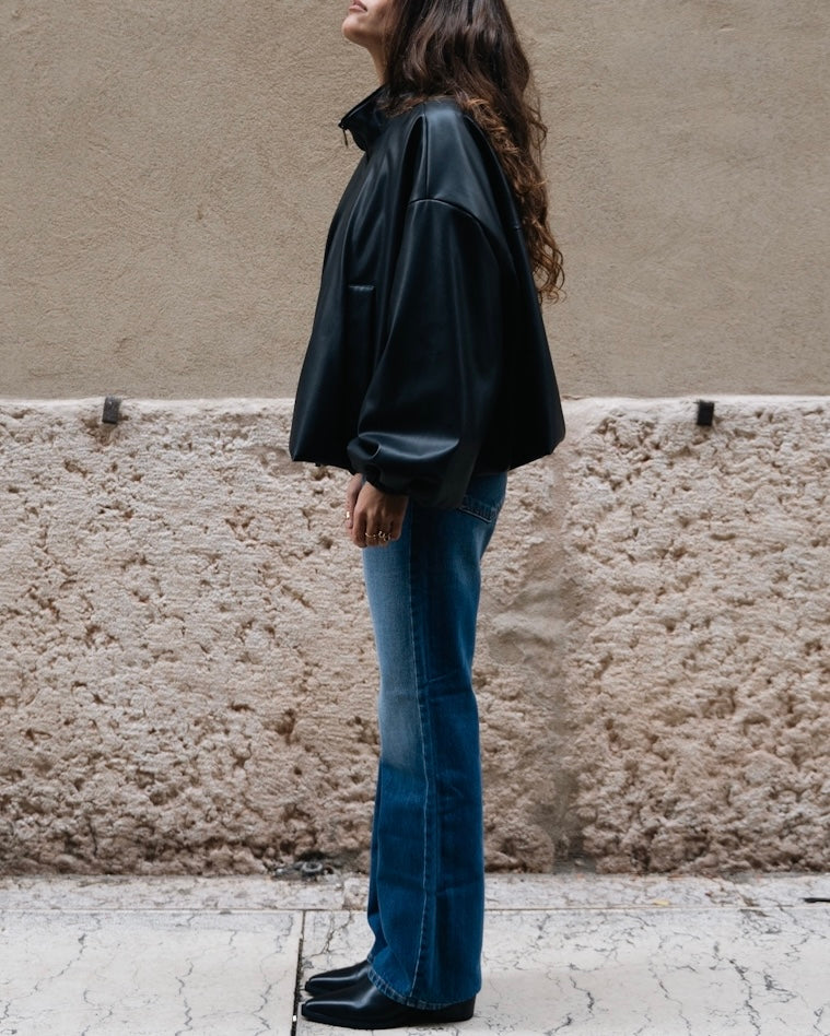 Giacca bomber in ecopelle, chiusura con zip e tasche frontali.