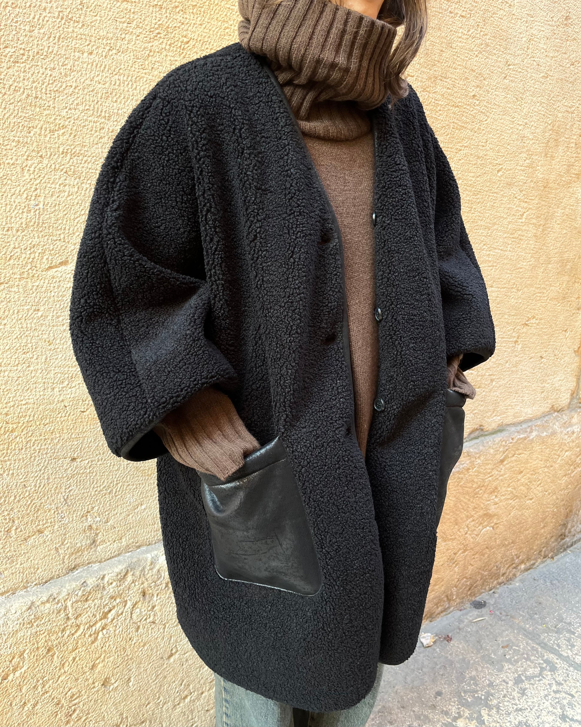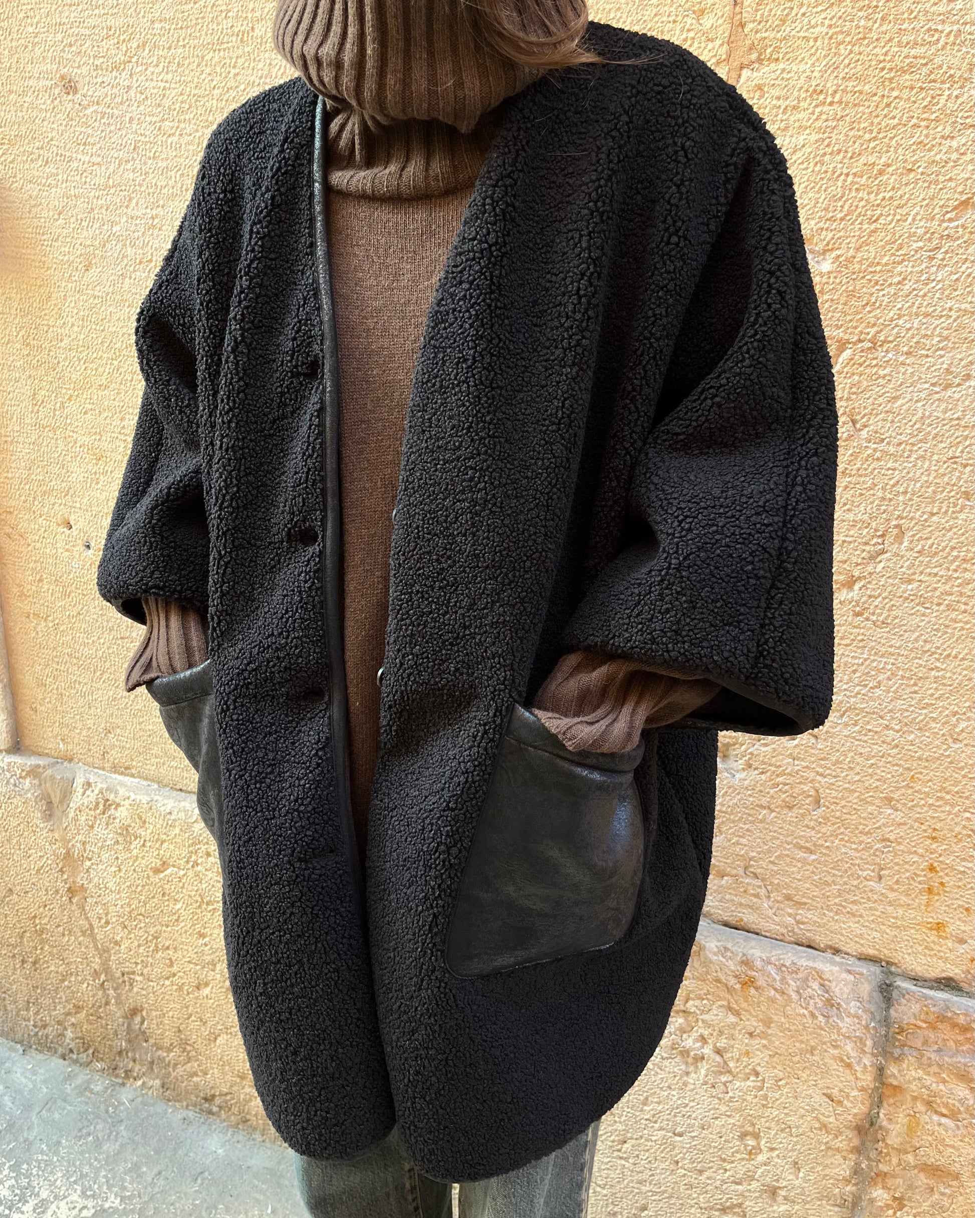 Giacca monopetto oversize con spalla scesa e manica a kimono in tessuto poliestere effetto montone.
