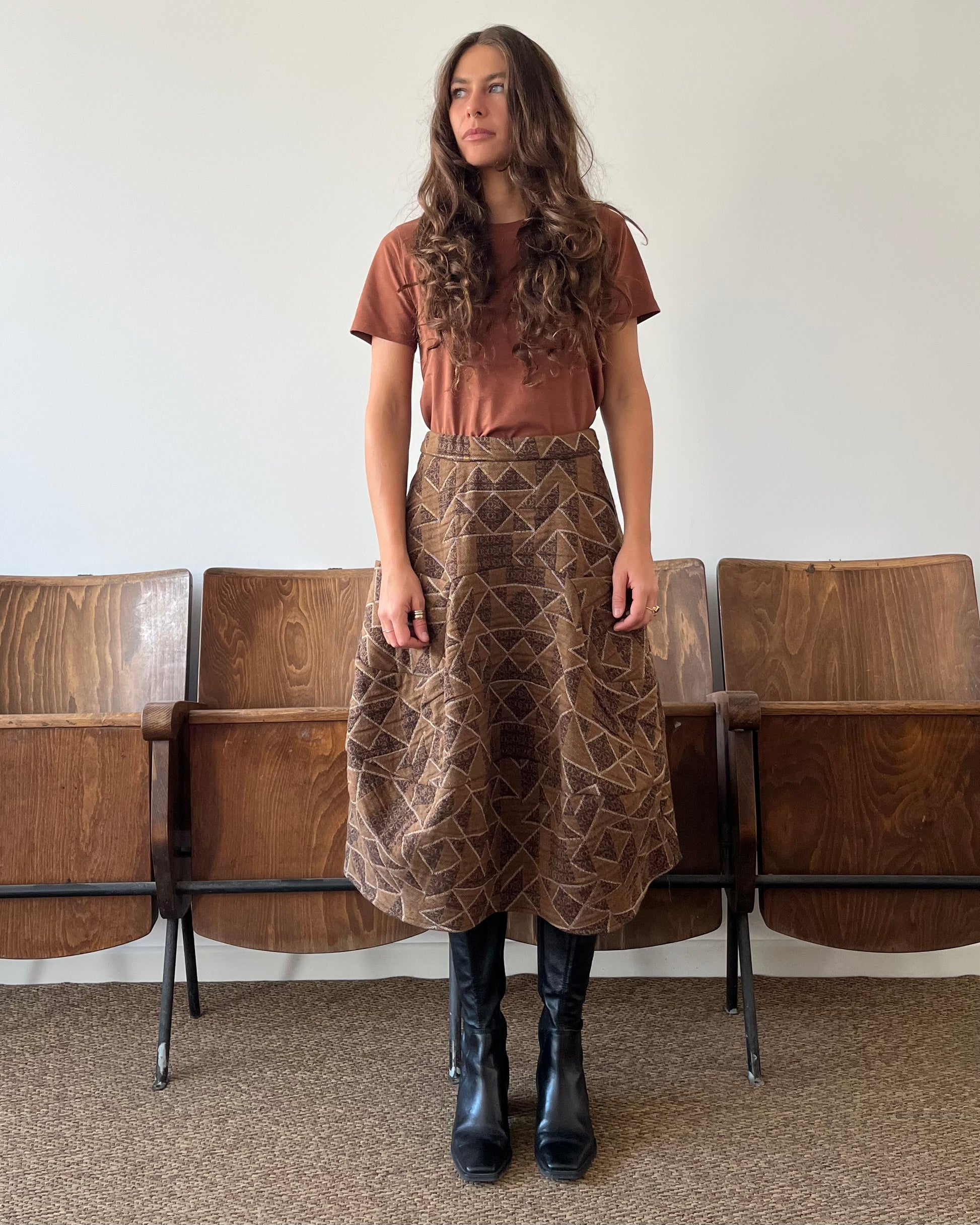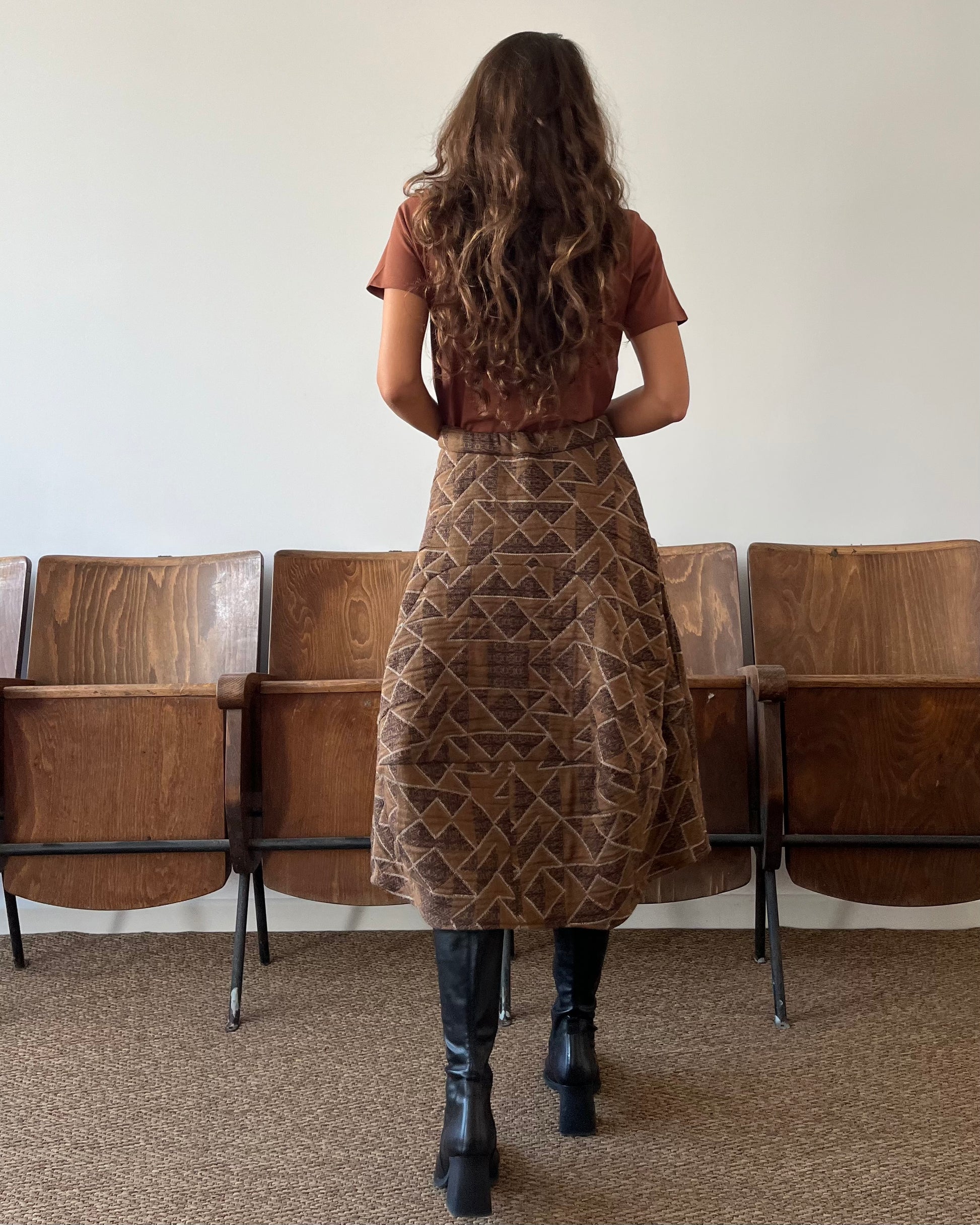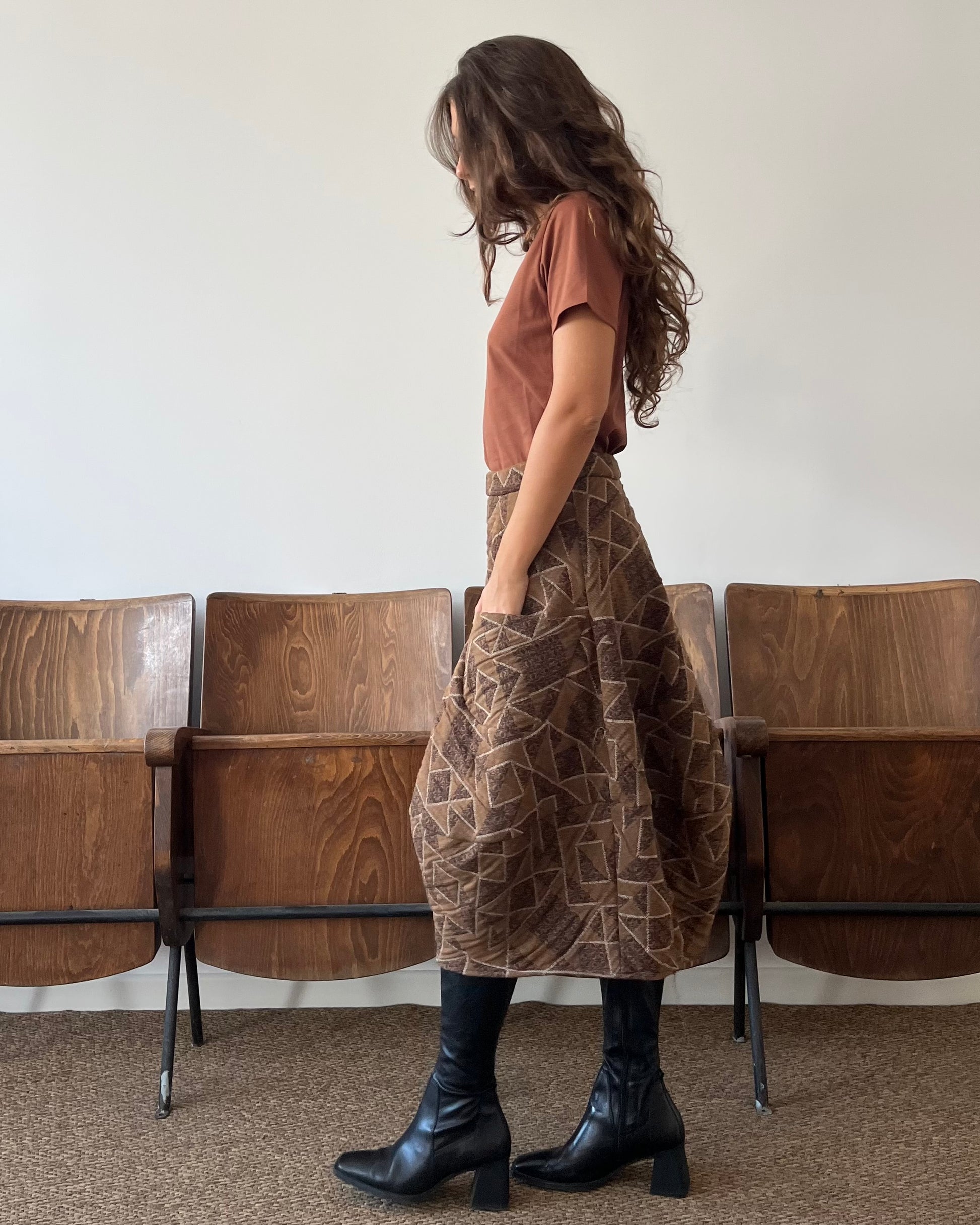 Gonna midi con forma arrotondata e tasconi frontali. Elastico in vita e chiusura con zip.