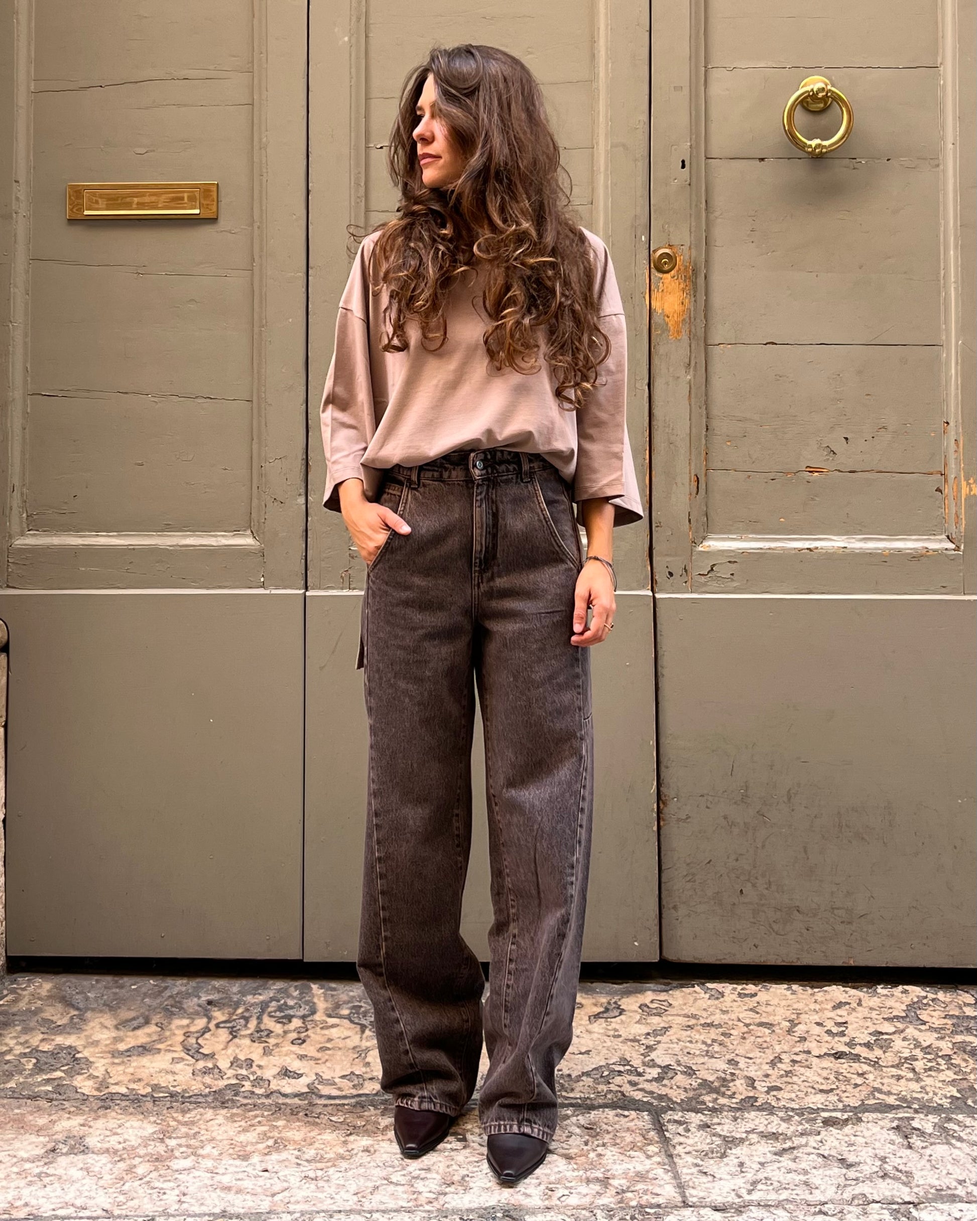 Jeans con gamba lunga leggermente curvata, vita alta e tasche work.