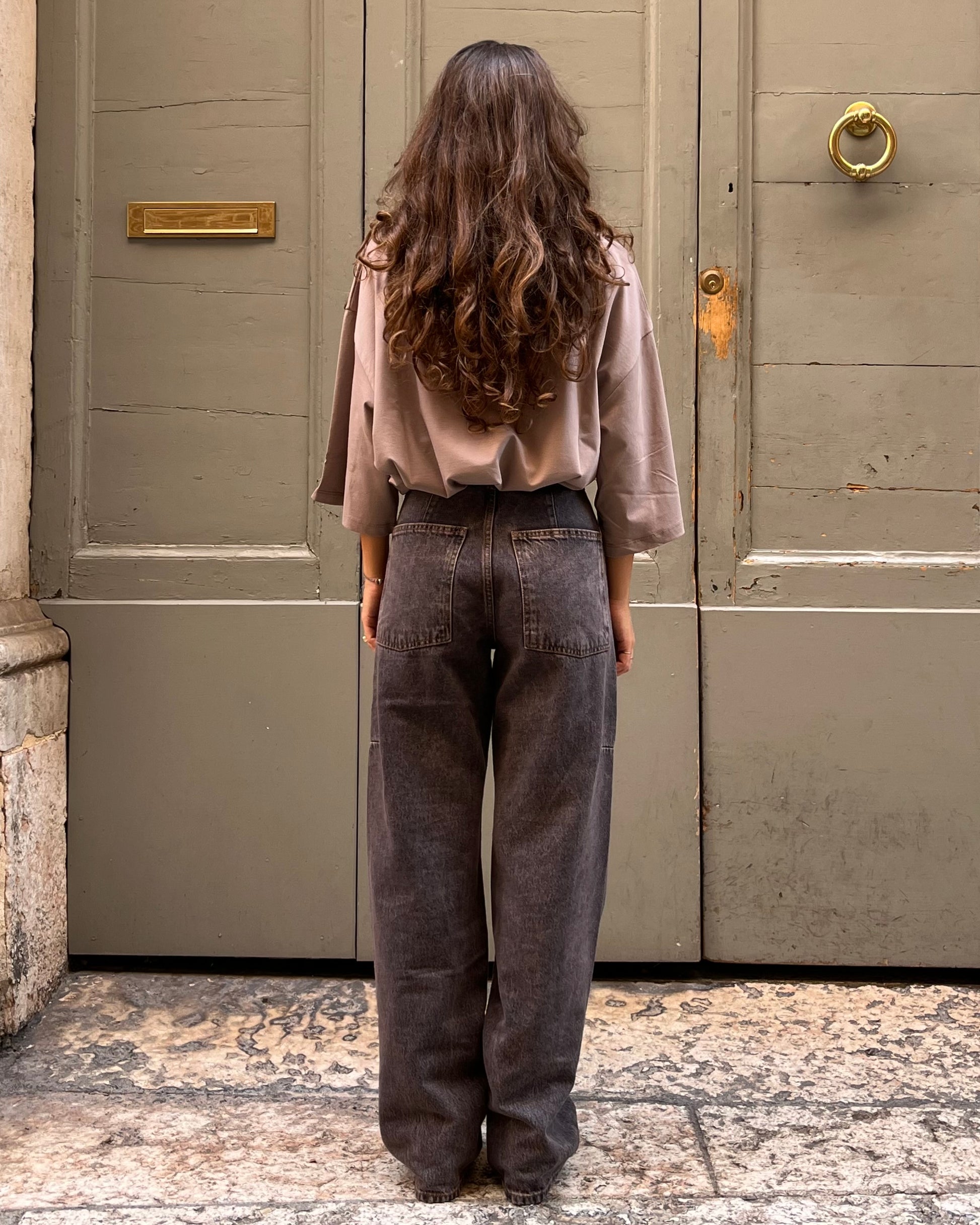 Chiusura frontale con zip e bottone metallico. Lavaggio dirty black, tessuto 100% cotone.