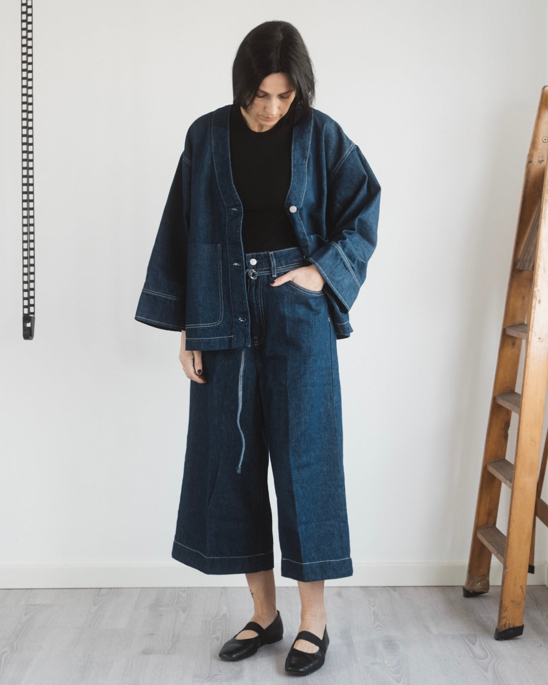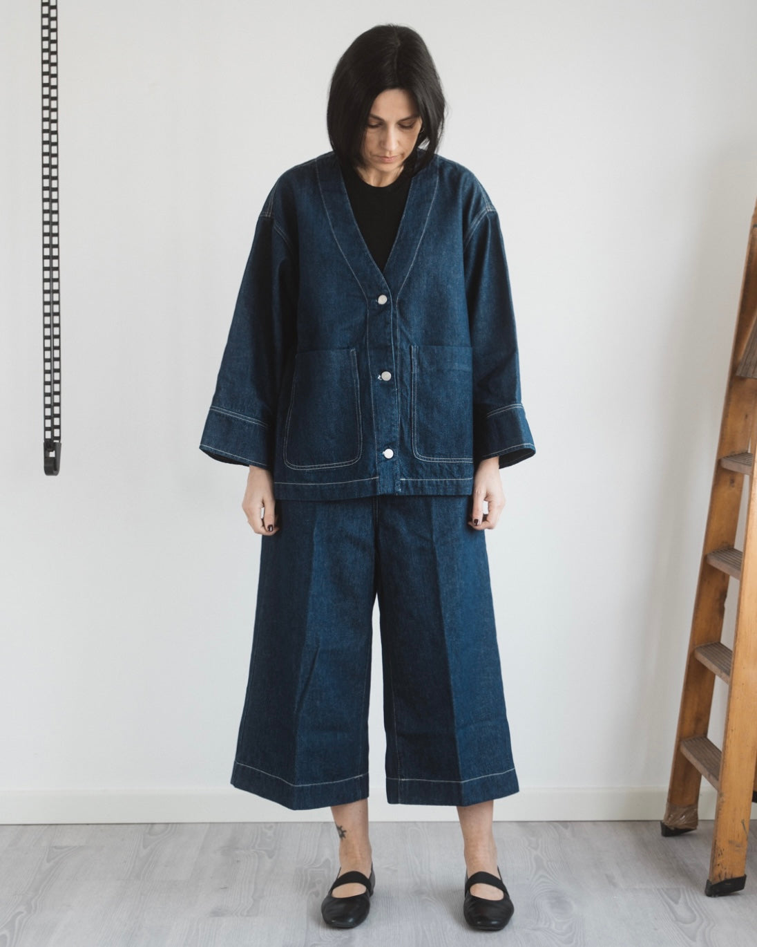 Jeans culotte in denim indaco blue con cuciture sabbia.