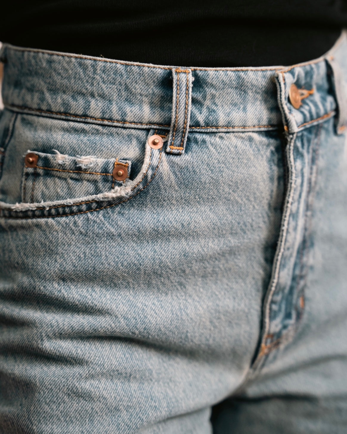 Tessuto 100% cotone, 12 once. Denim blu super stone sovratinto con tintura naturale.