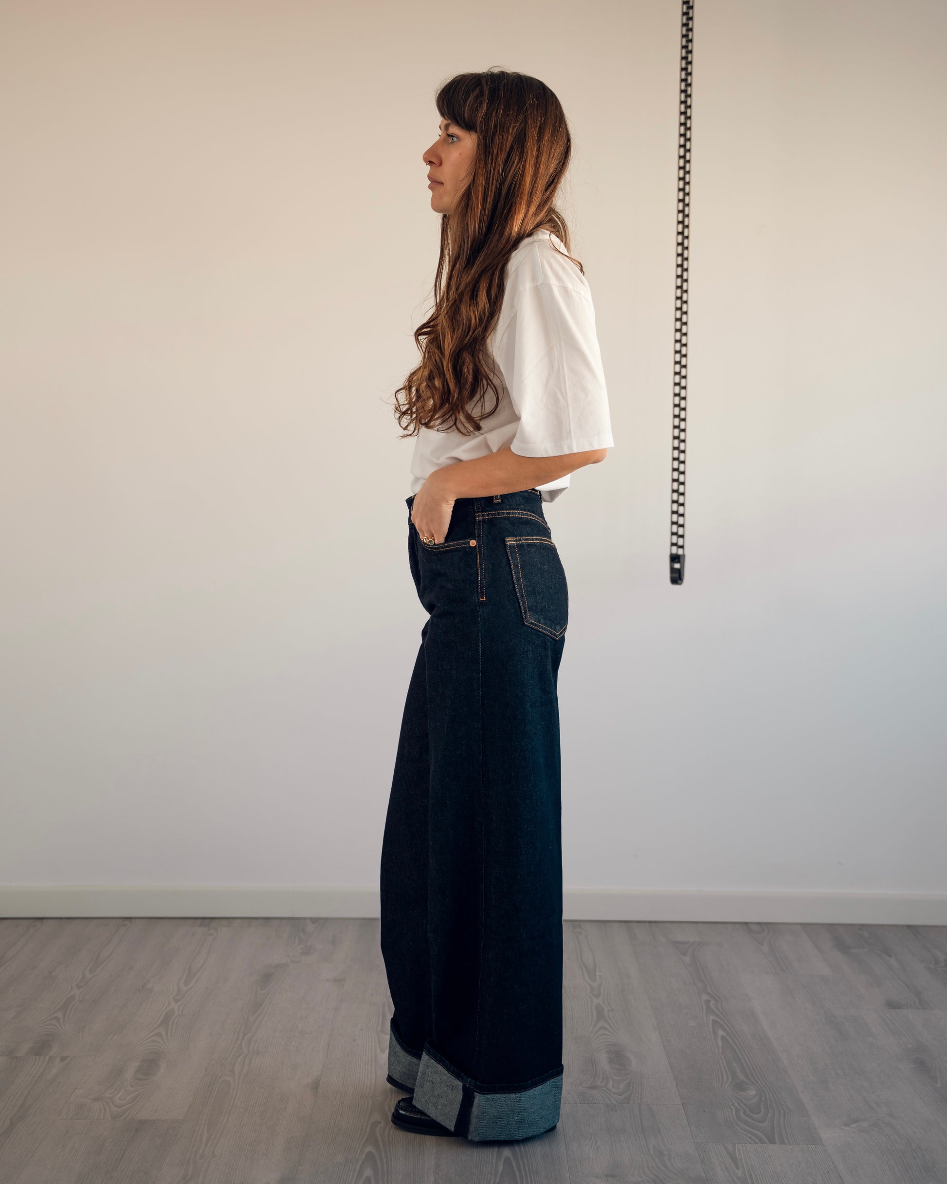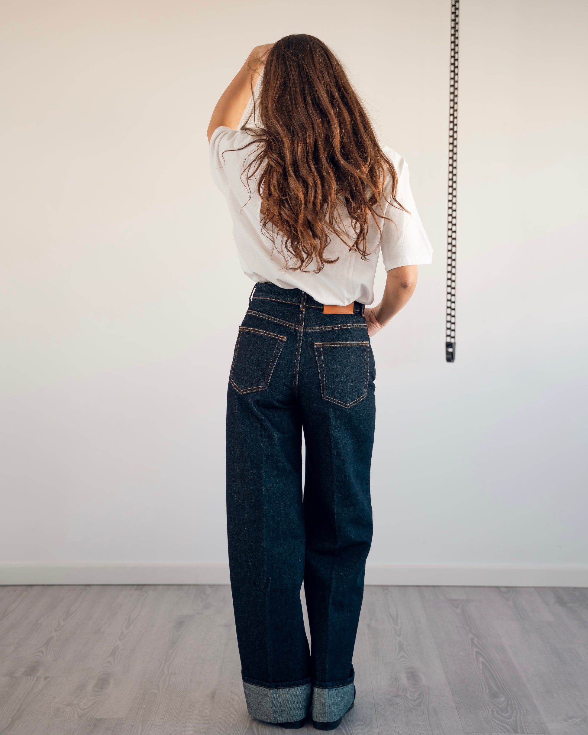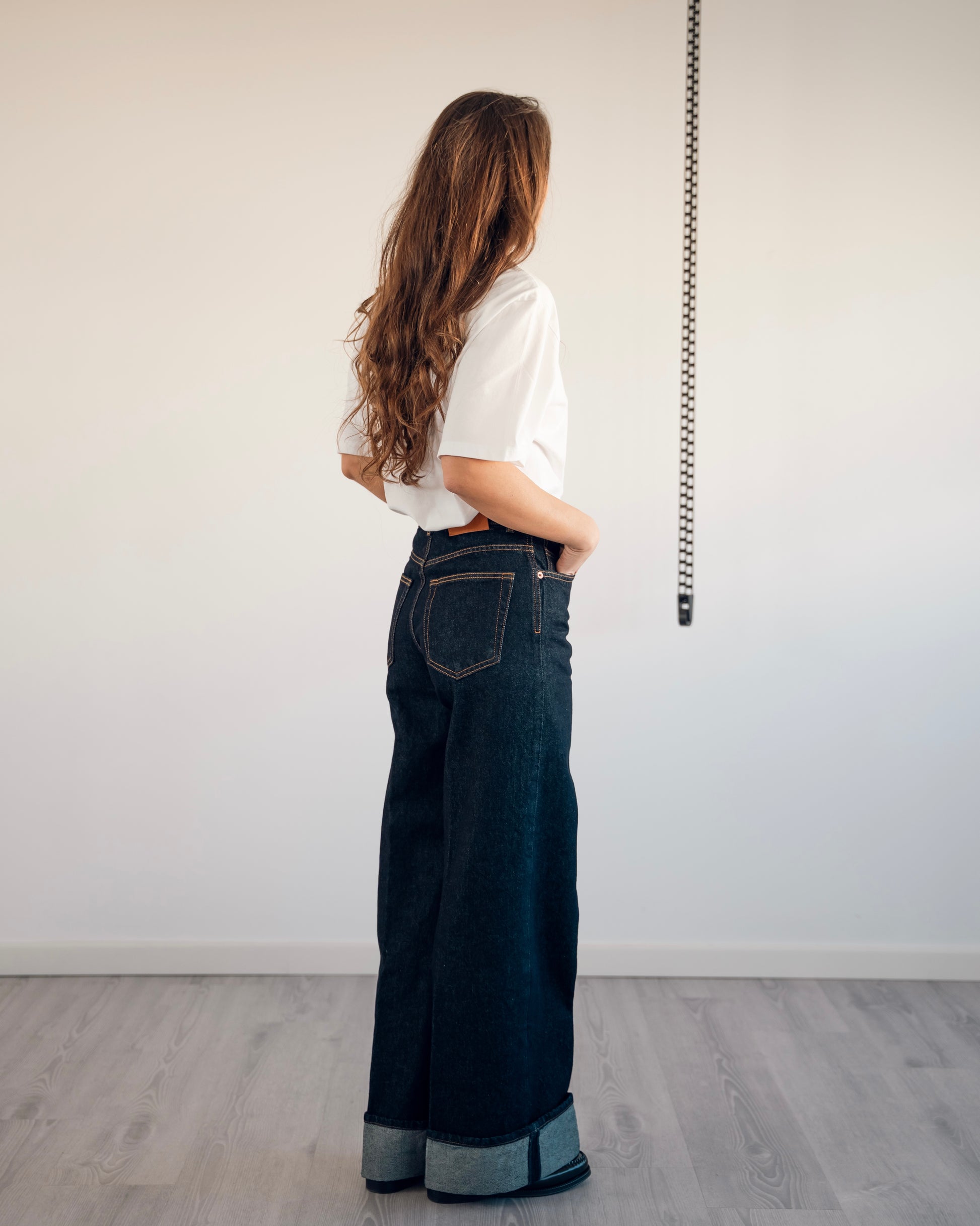 Lavaggio raw blue, chiusura frontale con bottone e zip. Tessuto denim 100% cotone, peso 12 once.