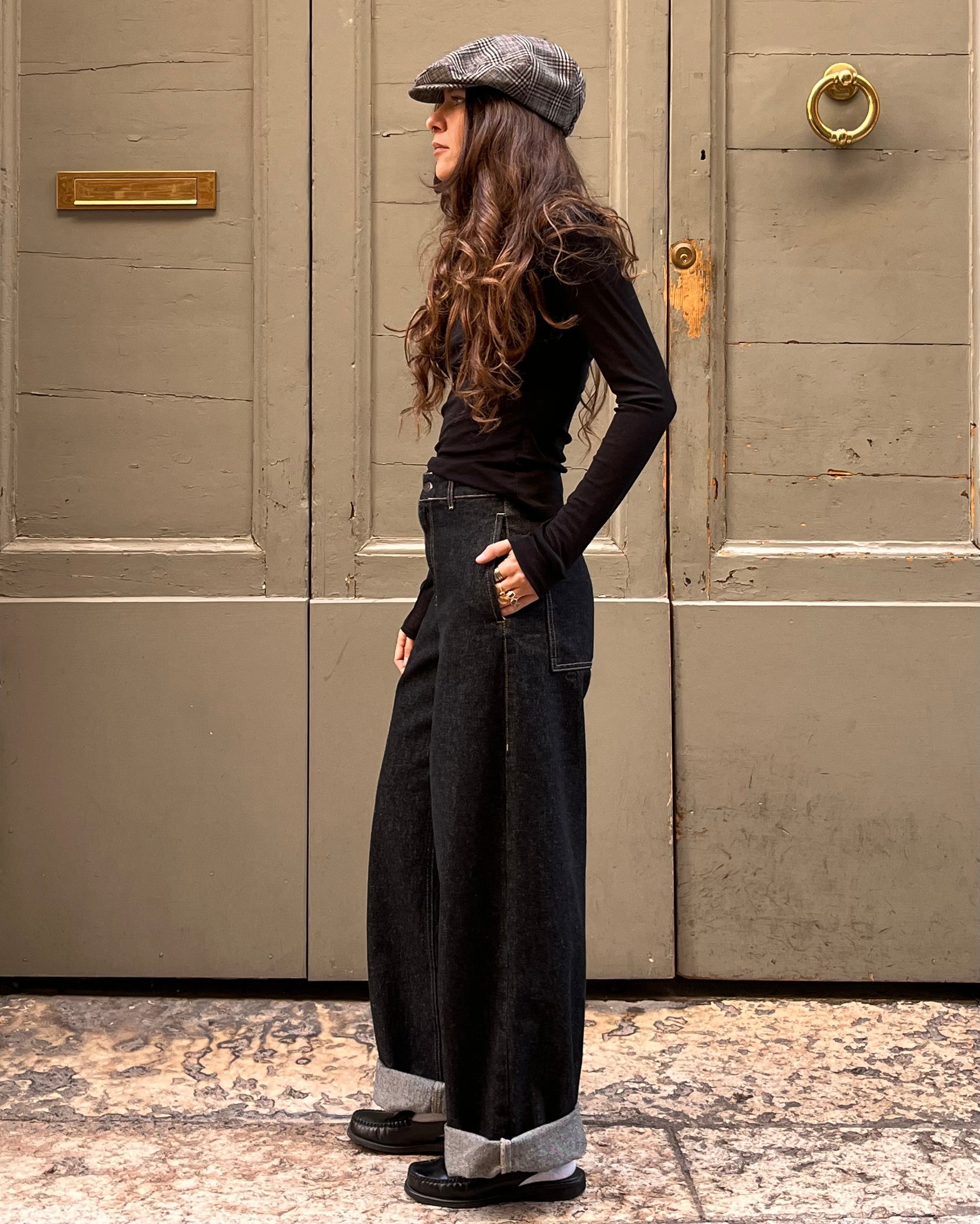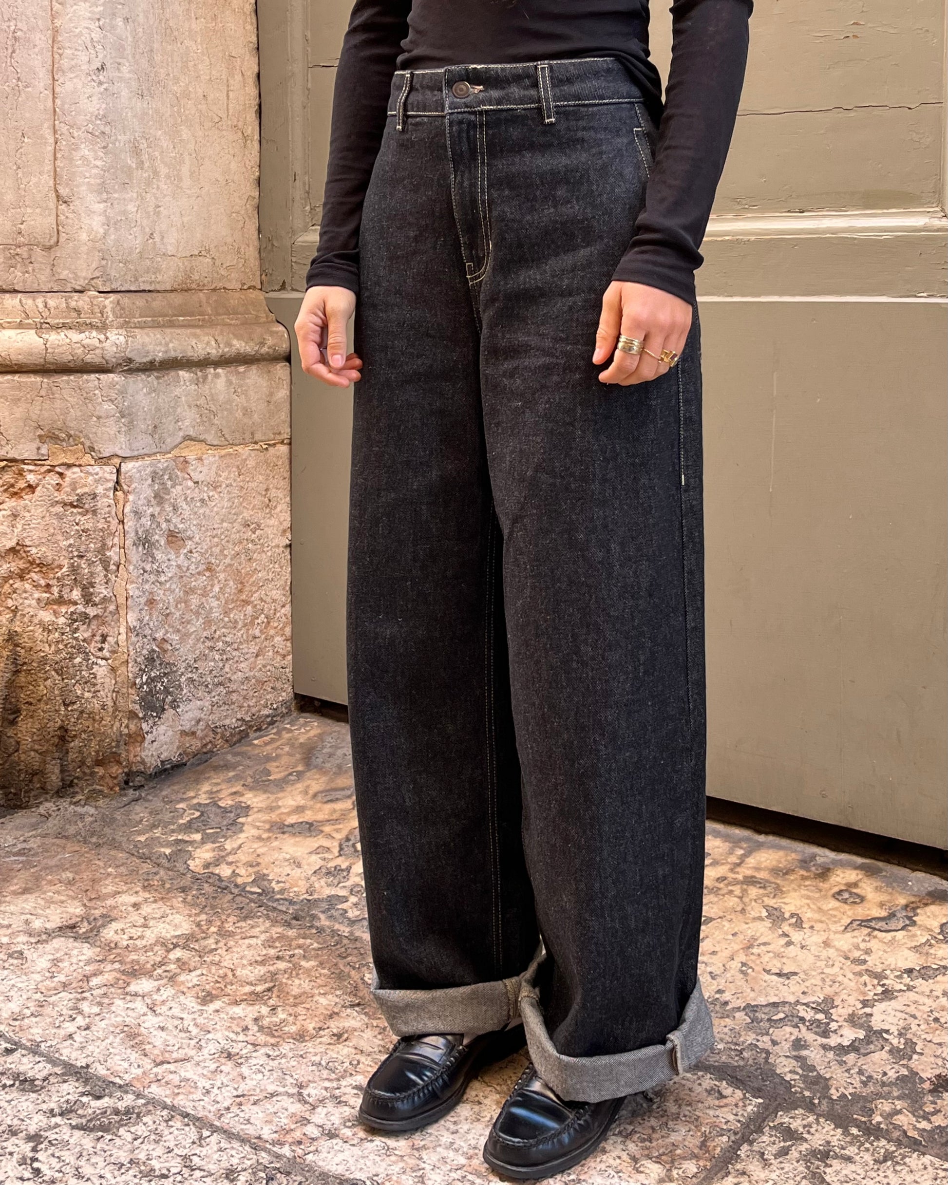 Jeans barrel-leg con tasche anteriori alla francese, chiusura frontale con zip e bottone metallico e tasche posteriori applicate.