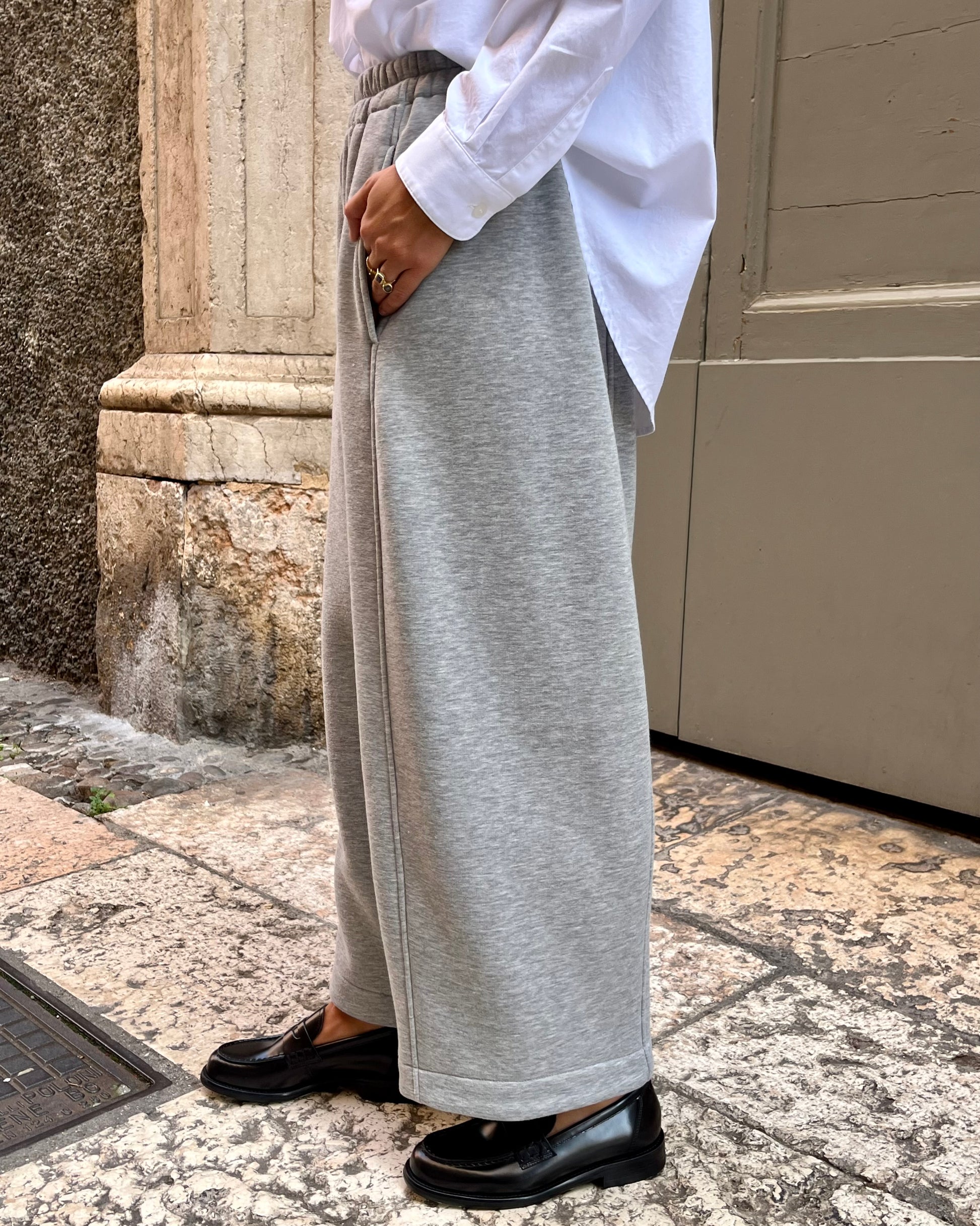 Pantalone jogger in felpa color grigio chiaro.