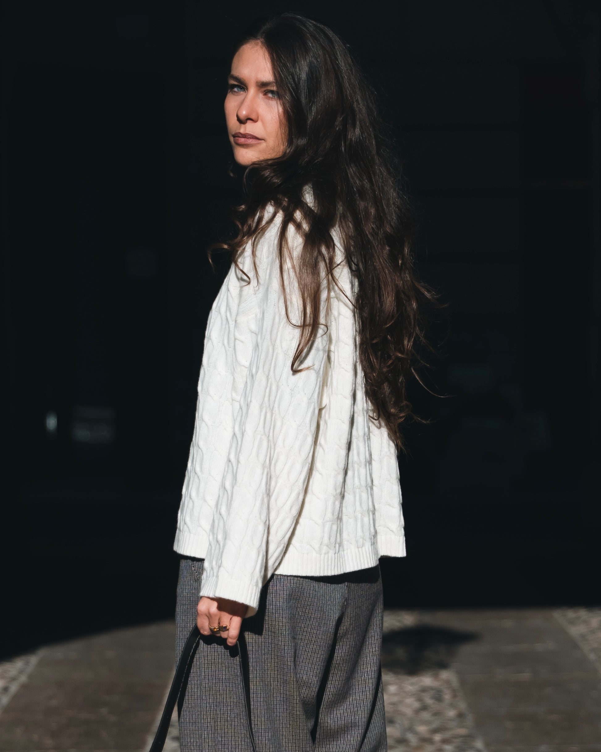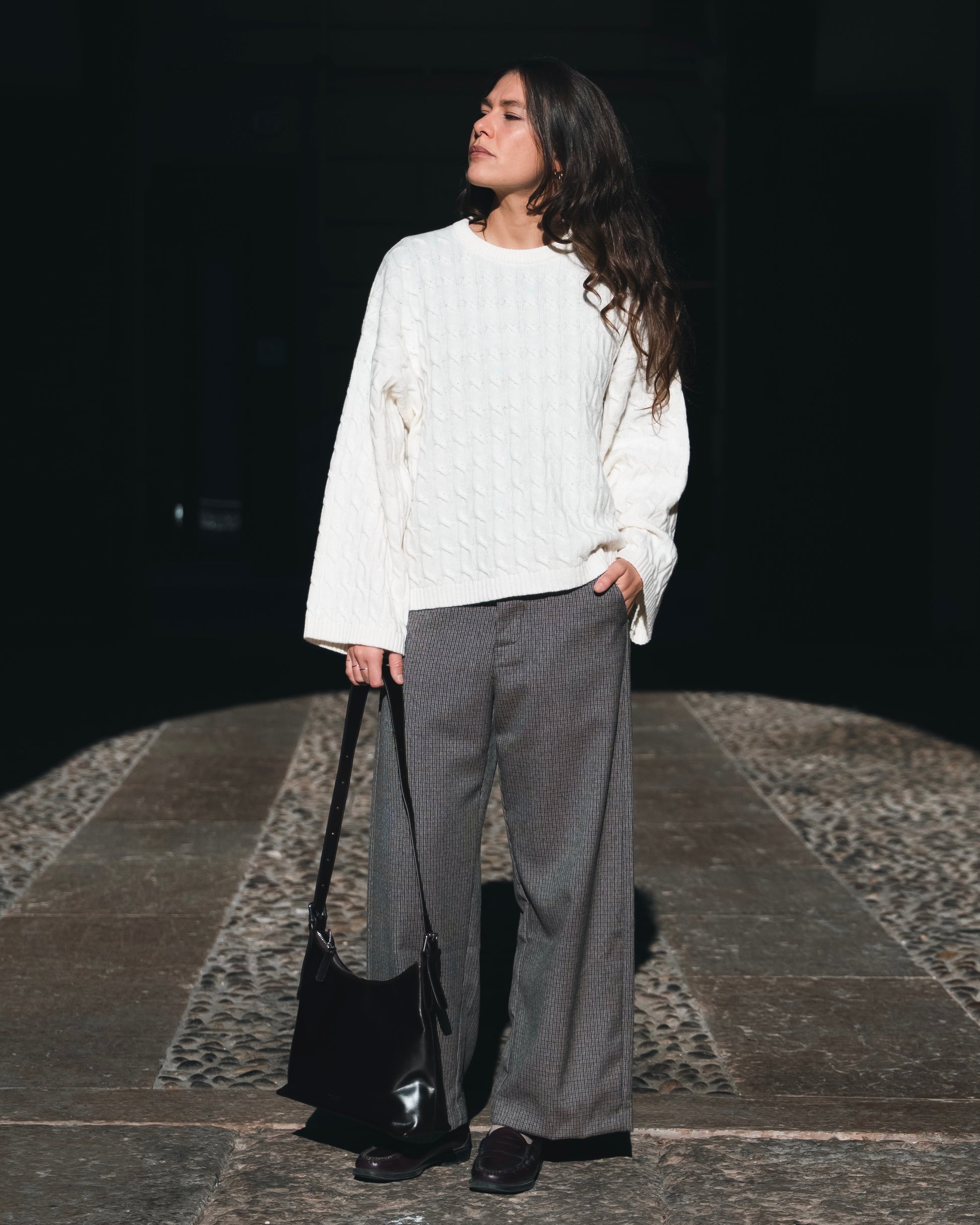 Vestibilità morbida, spalla scesa, maniche larghe.