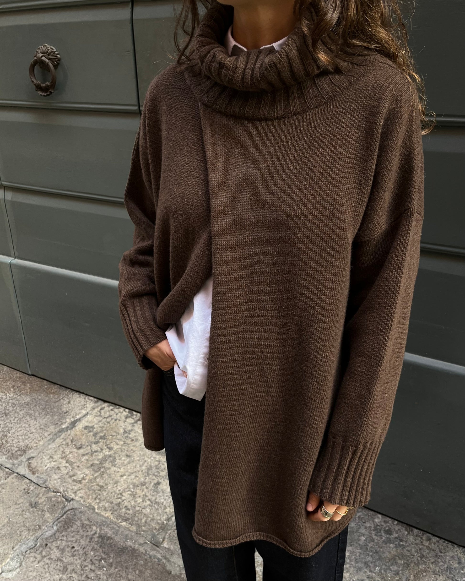Maglione con collo alto, vestibilità morbida e dettaglio di apertura frontale.