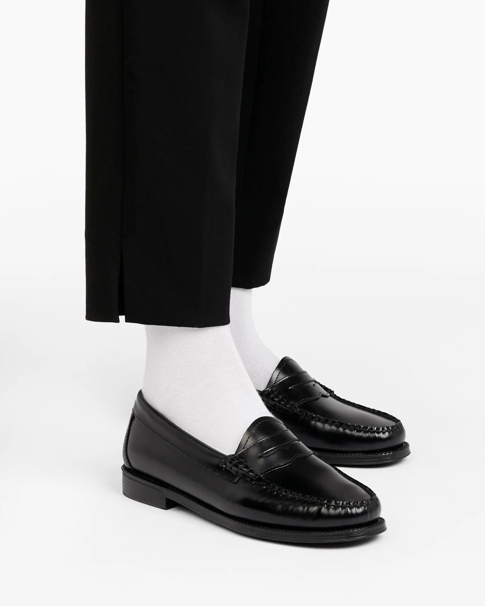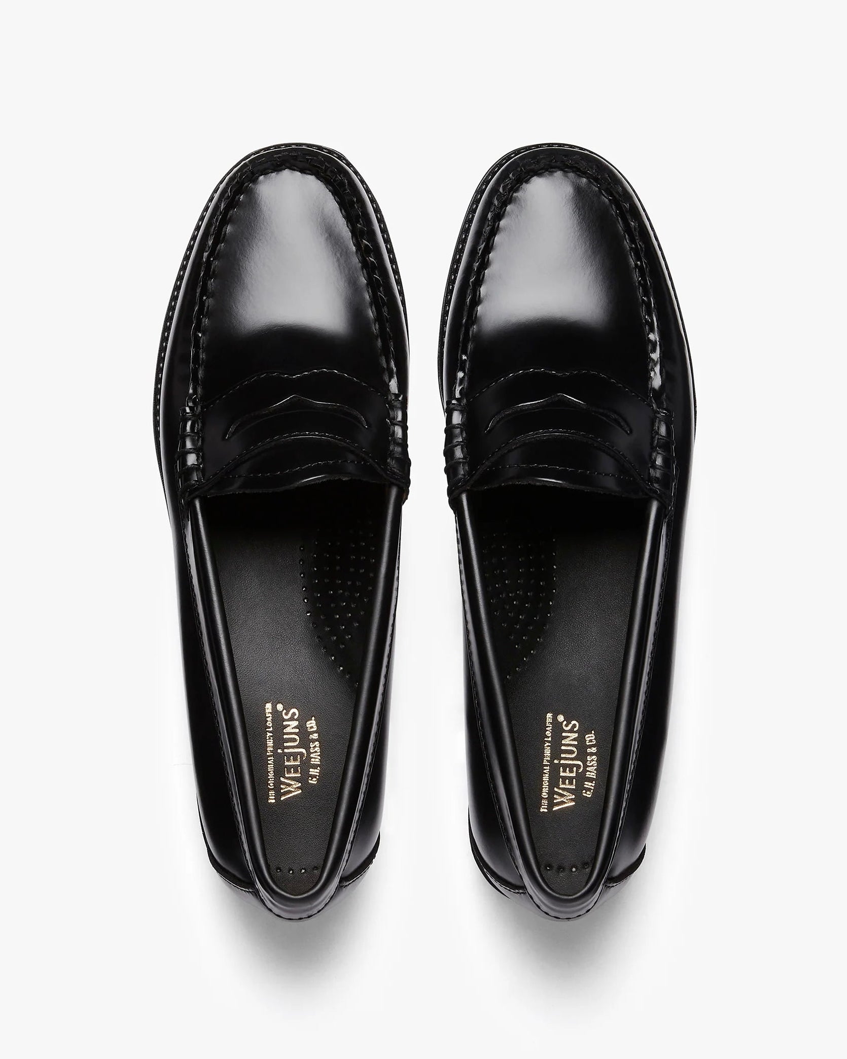 Mocassini Penny Loafers in pelle nera di G.H.BASS che uniscono modernità e design tradizionale. Queste scarpe eleganti sono realizzate in pelle nera lucida e sono cucite a mano.