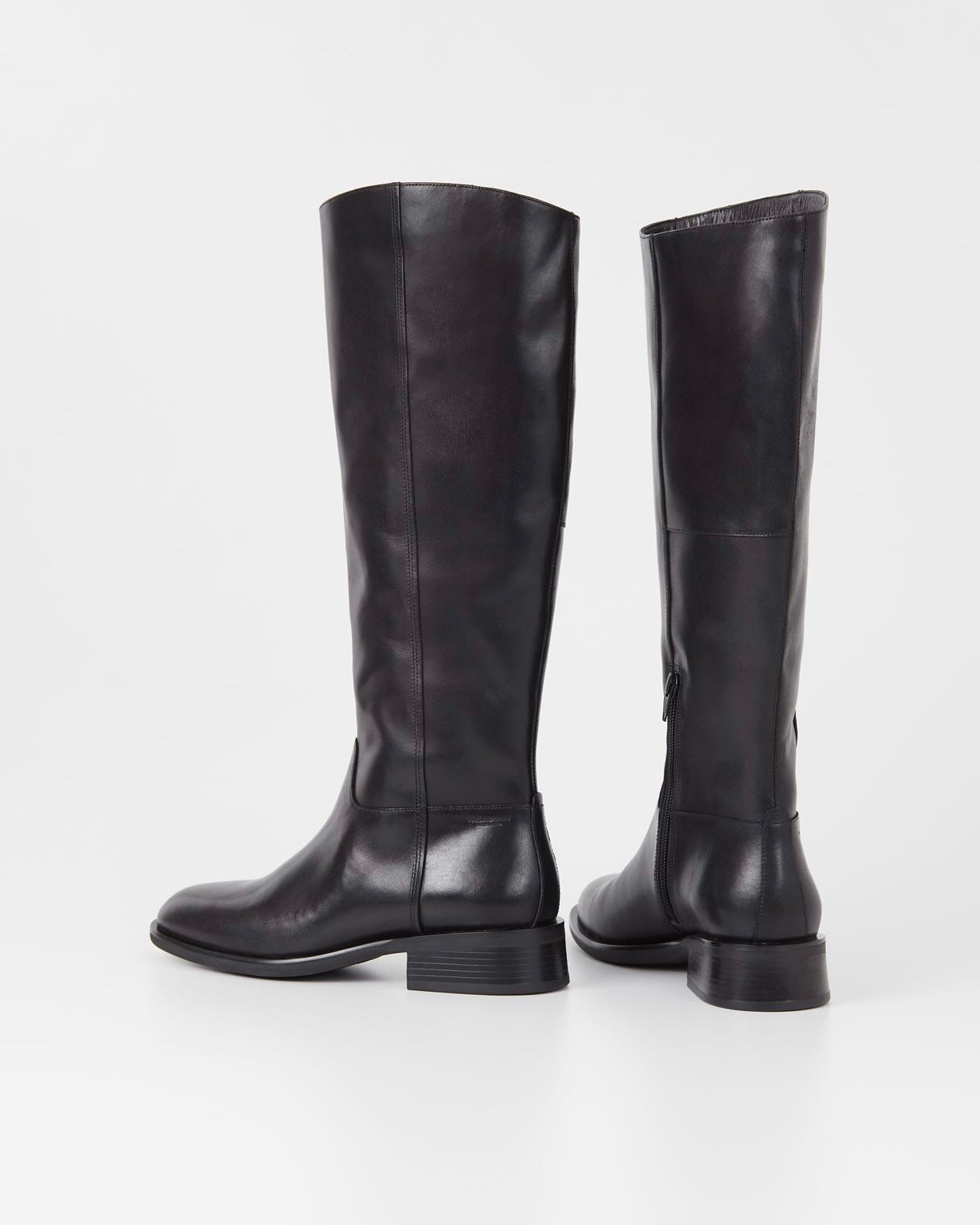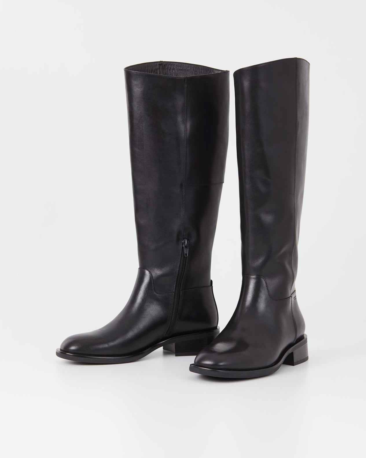 Stivale alto stile cavallerizza realizzato in pelle nera con punta arrotondata, gambale alto fino il ginocchio e chiusura a zip.