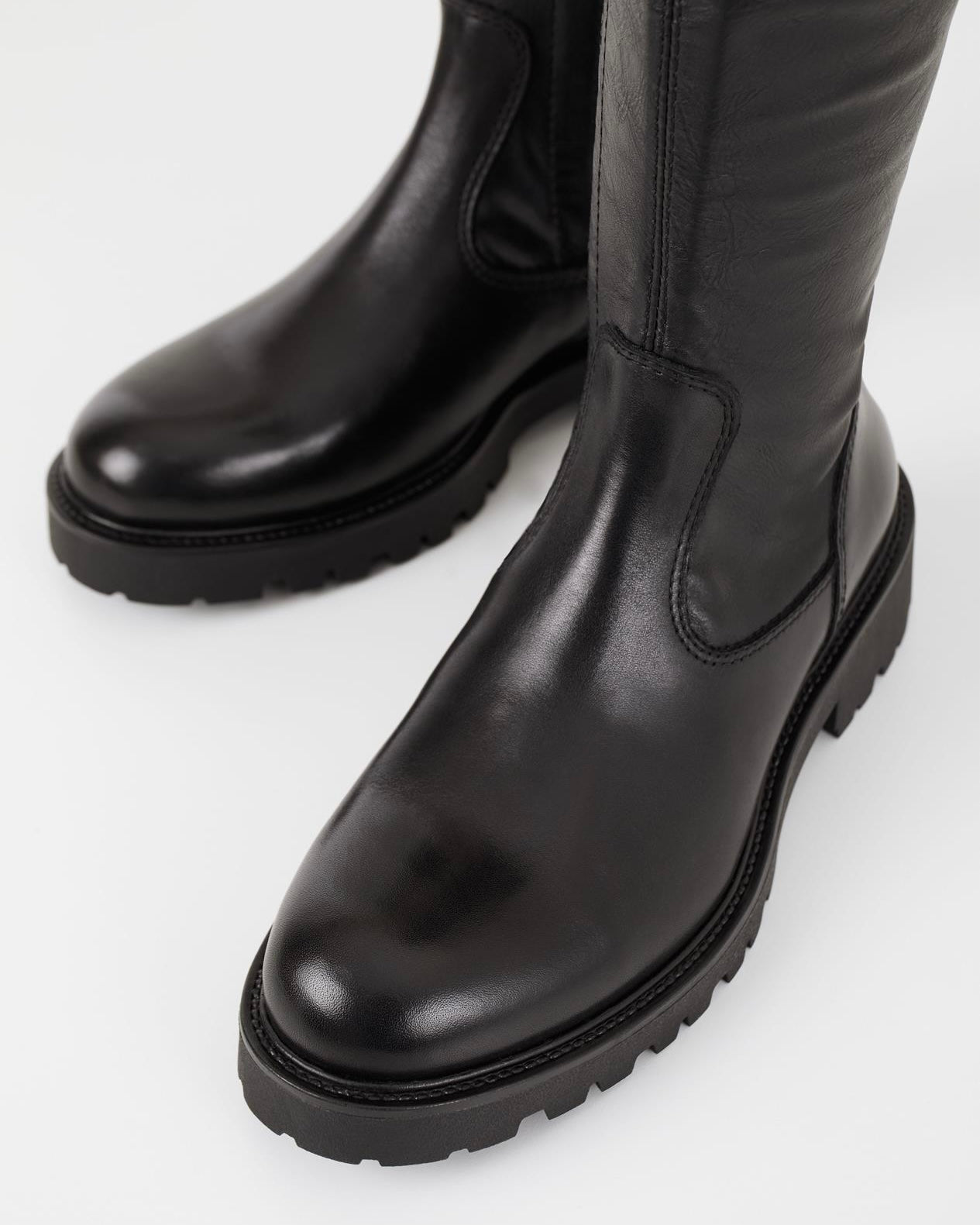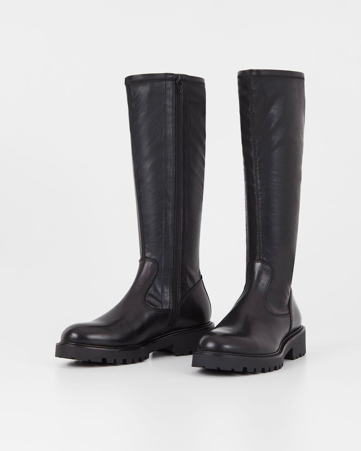 Stivali alti elasticizzati in pelle nera e in pelle sintetica con punta rotonda e gambale alto fino al ginocchio.